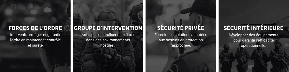 Quel que soit votre théâtre d’opérations, forces de l'ordre, groupes d'interventions spéciales... Nous vous accompagnons pour répondre à tous vos besoins, en adéquation avec les réalités de vos missions sur le terrain.